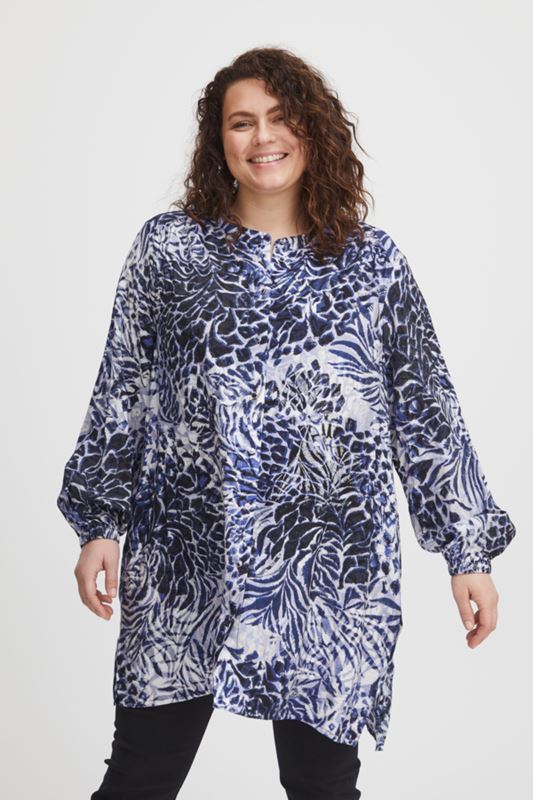 Helknäppt tunika med lång ärm samt resår i ärmslutet. Rynkeffekt bak. Slits i sidan. 80% viskose, 20% polyamid.